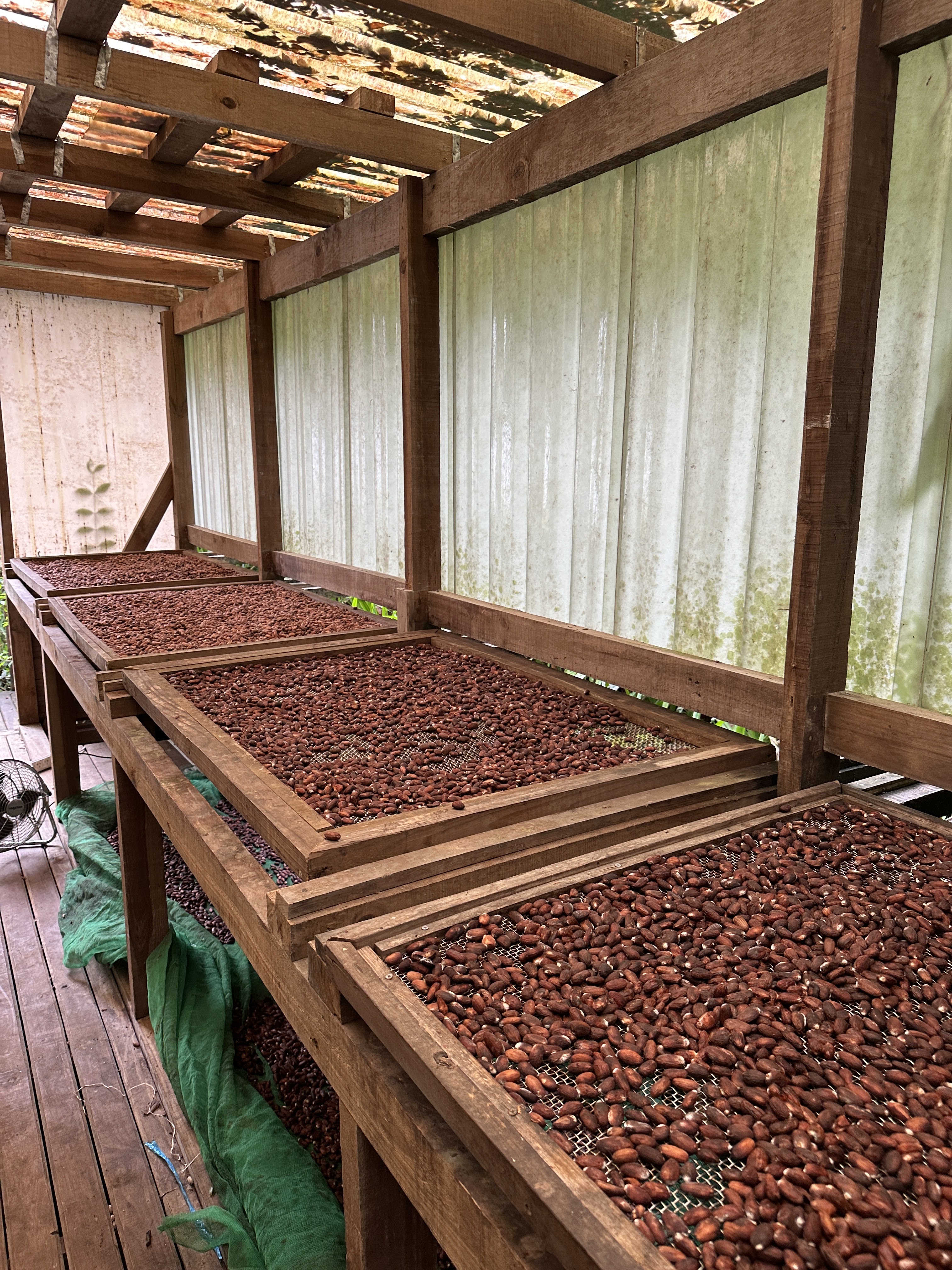 Inside, the cocoa beans are surrounded by a pod and covered in fruit. We got to taste the fruit surrounding the cocoa pod, it kind of tasted like passion fruit.
